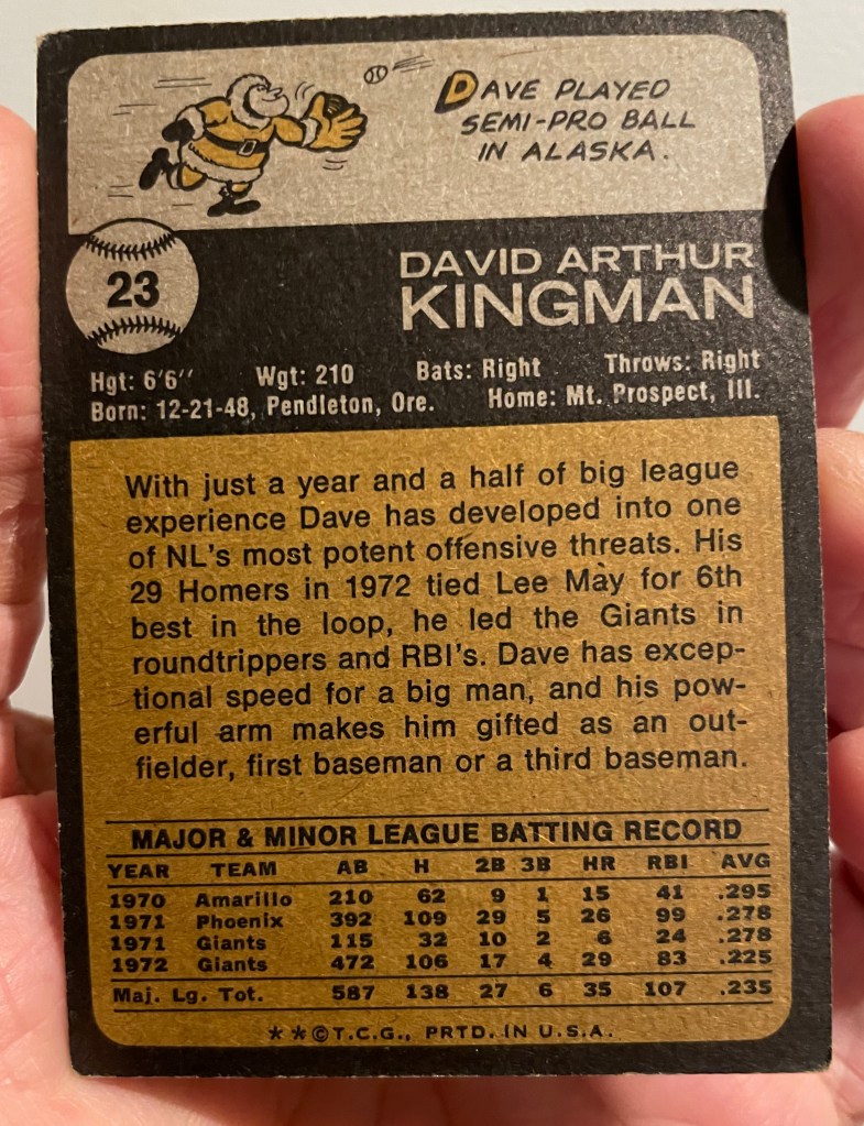 As I mentioned earlier, Dave had a talent for hitting home runs. He hit 442 of them in his career, a big number. But that was all he did. Early in his career, he was fast for a big guy, as the back of his 1973 baseball card says (in 1972, his breakout year, he stole 16 bases). His on-base average was pretty awful for a slugger — he struck out a ton and rarely walked, and his batting average crept below his weight on several occasions.