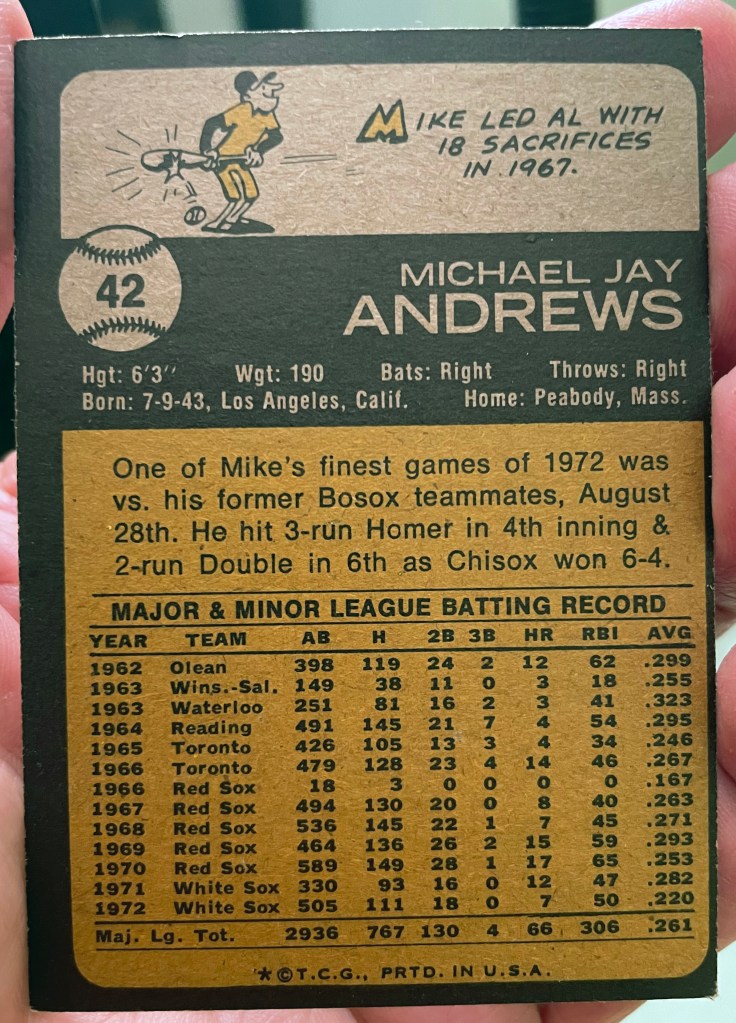 Mike Andrews’ 1973 card is his last. He began the season with the White Sox, who released him in July. The Oakland A’s picked him up for infield insurance.
