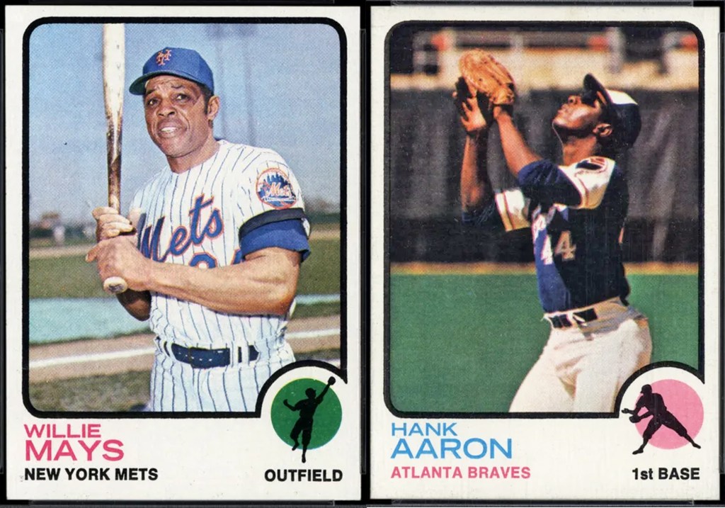 These good action shots helped elevate a card’s status for me. Don’t get me wrong. Finding a Willie Mays in your pack is a great card no matter what he’s doing in the photo. In his 1973 card, for example, Willie poses with a bat and looks sturdy, if a bit out of place, in his pinstriped Mets uniform. Willie has an uncomfortable look on his face. Still, it’s Willie Mays and it’s his last card, so it’s cool. But the Henry Aaron card … so much better. Aaron is seen in game action, close up, fielding a pop fly at first base.