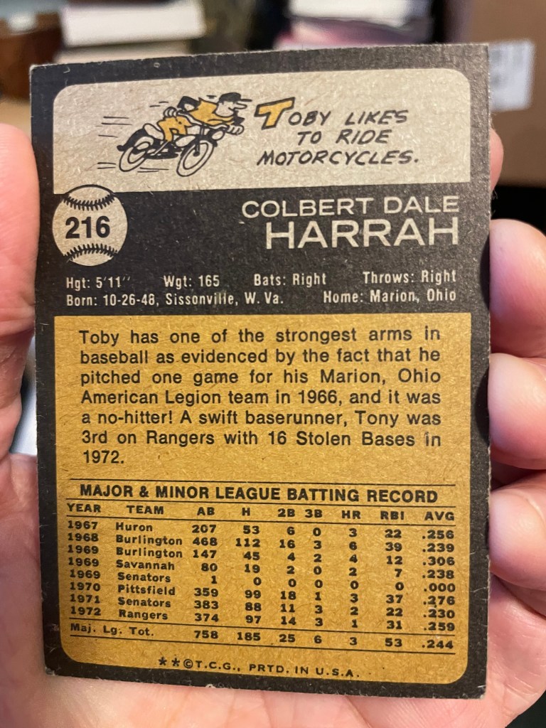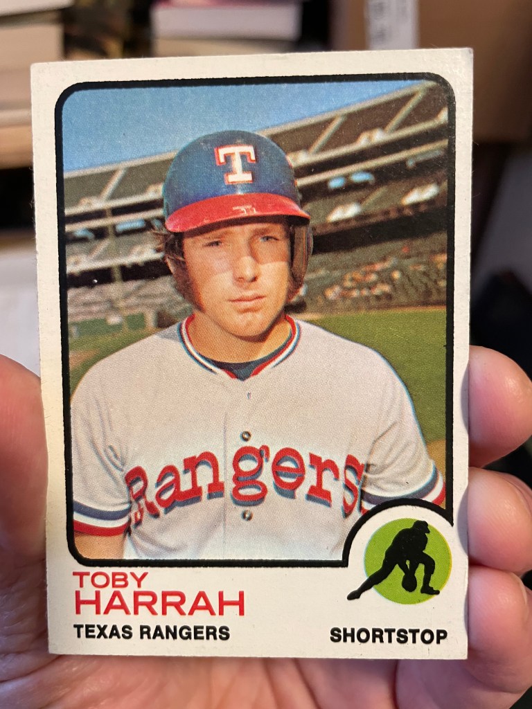 Look at Toby on this 1973 baseball card, full of youthful spirit and mischief, early in his excellent career, his palindrome name in bold red, matching the letters of his Rangers uniform.